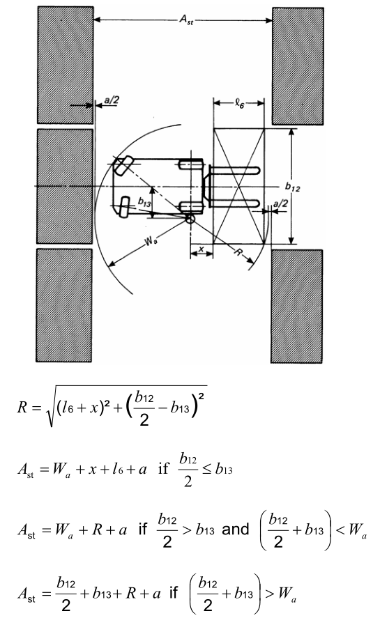 二、其次确定叉车操作容差a(见上面各图所示),一般为200mm。当存储单元尺寸异常导致操作与堆垛困难、生产率要求或叉车驾驶员技能水平变化时,应适当增大a的值。