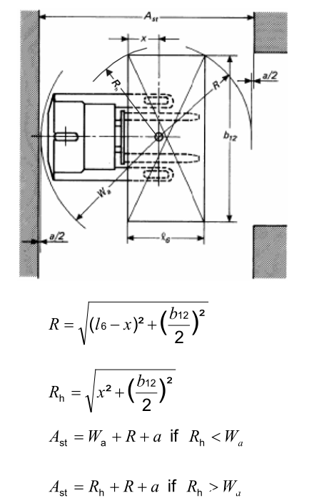 一、首先根据叉车的具体类型与存储单元的规格尺寸,计算叉车绕转动中心转动时所需的空间尺寸Wa和R。